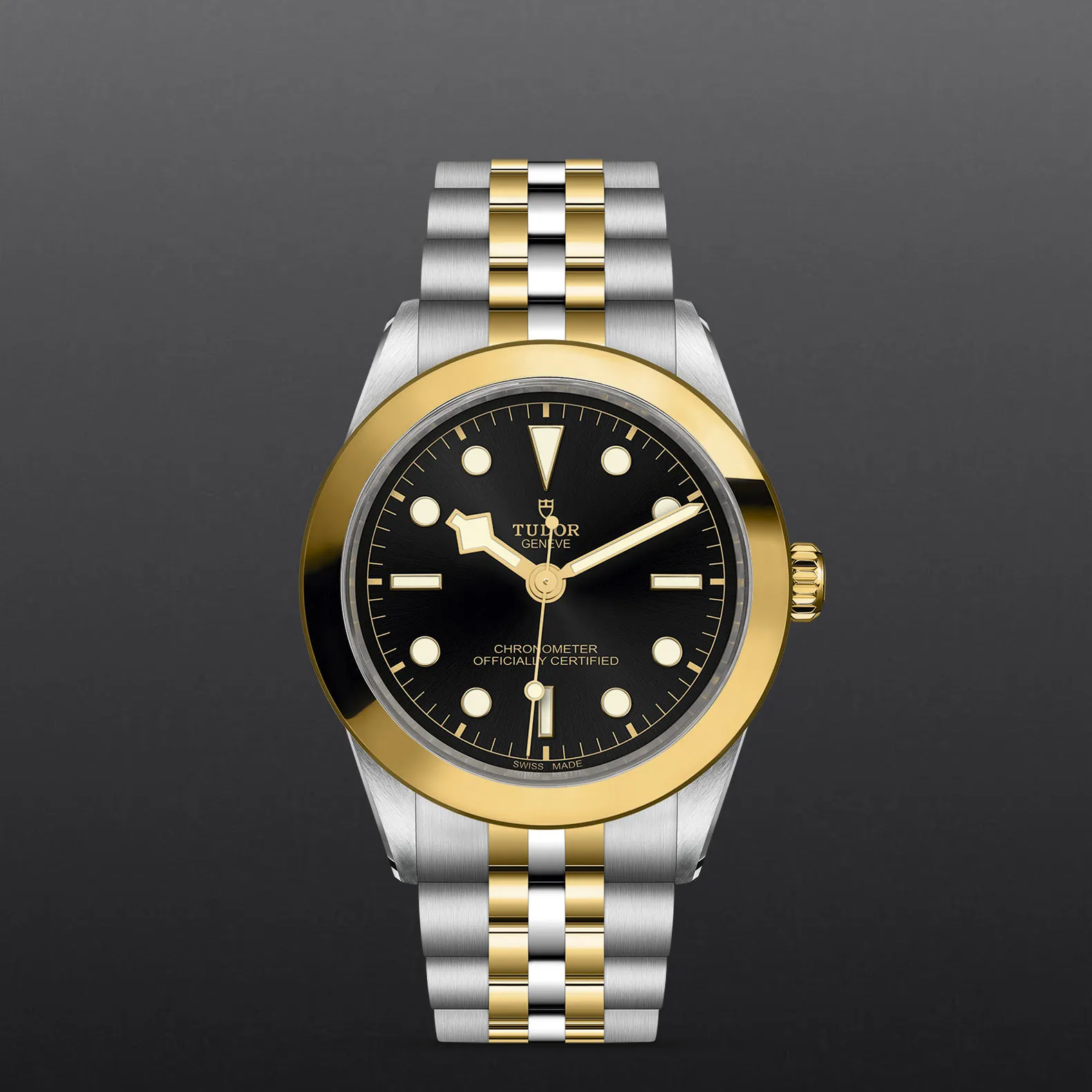 Prime maglie centrali in acciaio o in oro giallo massiccio. Le altre maglie centrali sono costituite da un’anima in acciaio rivestita da 0,2 mm di oro giallo. Chiusura pieghevole TUDOR “T‑fit” con fermaglio di sicurezza. Il logo sul fermaglio è realizzato in oro giallo massiccio.