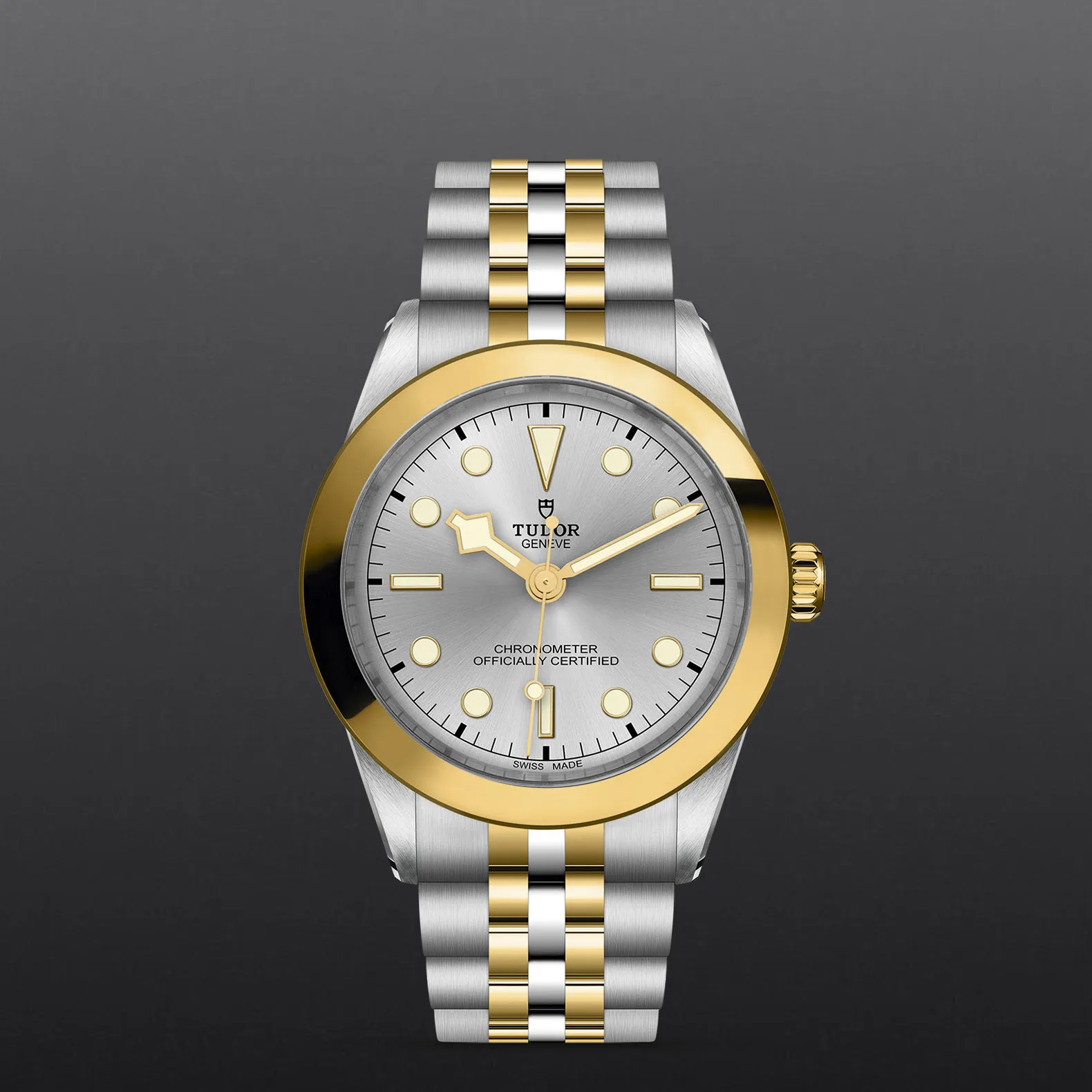 Prime maglie centrali in acciaio o in oro giallo massiccio. Le altre maglie centrali sono costituite da un’anima in acciaio rivestita da 0,2 mm di oro giallo. Chiusura pieghevole TUDOR “T‑fit” con fermaglio di sicurezza. Il logo sul fermaglio è realizzato in oro giallo massiccio.
